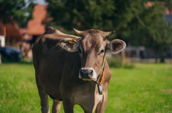 helle Braunviehkuh mit dunklen Fellschattierungen